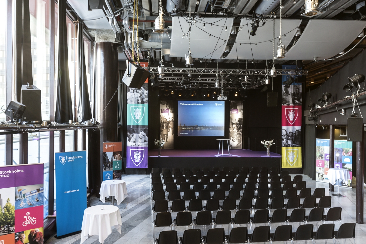 Studion ligger i gatuplan, med folklivet och Sergelfontänen direkt utanför de stora fönstren. Det här rummet är ”mitt i city”. Lokalen har ett fantastiskt ljusinsläpp, men går även att mörklägga. En stor öppen yta, åtta meter till taket och ett tillhörande entresolplan en halv våning upp, gör Studion till en flexibel och användbar lokal.
