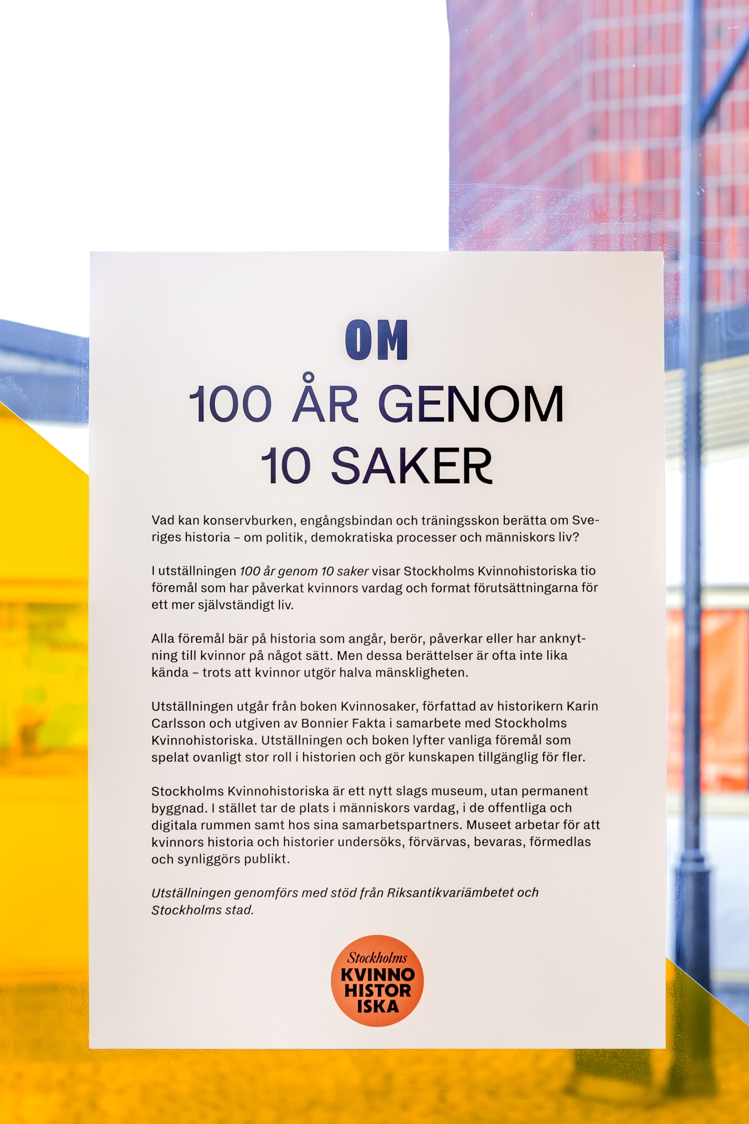 Vad kan konservburken, engångsbindan och träningsskon berätta om Sveriges historia – om politik, infrastruktur, demokratiska processer och människors liv? I utställningen 100 år genom 10 saker visar Stockholms Kvinnohistoriska tio föremål som bär på berättelser som har påverkat kvinnors vardag och format förutsättningarna för ett mer självständigt liv.